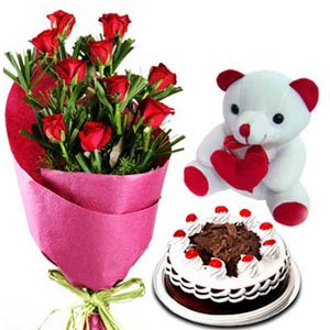 A Gift 2 youOne dozen red roses bunch type bouquet w/ 8 inches teddy bear w/ pillow and choco mocha cake. A nice gift when you fall in love with someone but don't know what to offer her.