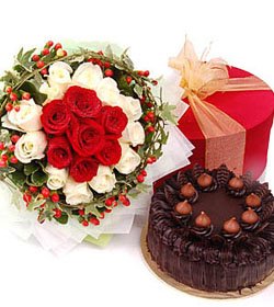 A special giftChocolate cake, cookies and 6 red & 12 white roses bunch.a perfect special gift for a very special person to you.