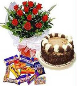 Loving you10 different types of chocolates, 12 red roses in vase and chocolate cake for you my love.Your gift will come with a greeting card and your message.