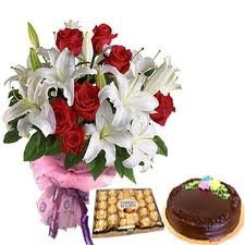 See you soonSend beautiful lilies,red roses and mixed flowers in a bouquet .it contains Pink Lilies and mixed flowers and greens. A free Card is attached.24 pcs Ferrero and cake included.
