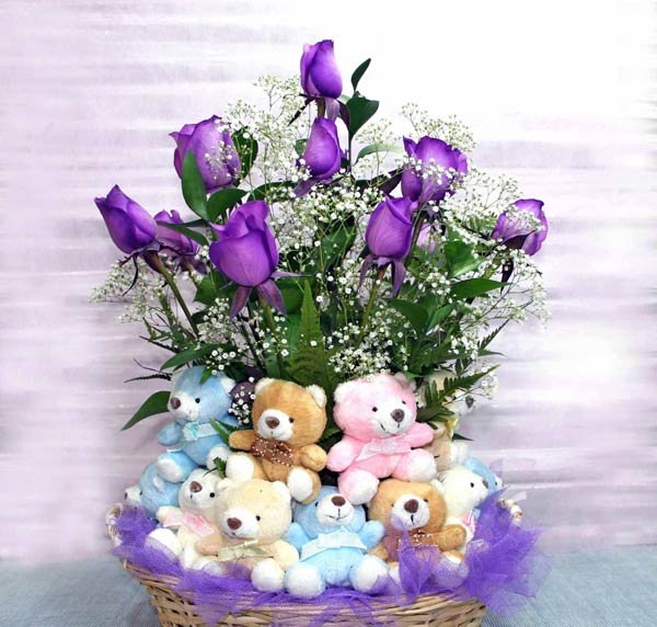 Purple In a Basket12 Purple Roses With 8 Mixed Color small Bears In a Basket