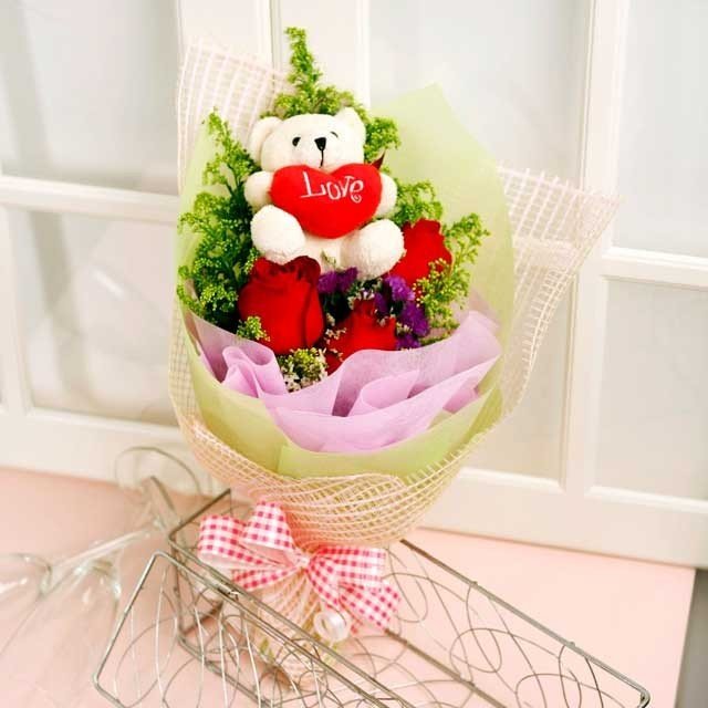 THE 3-WORD SENTENCE3 Stalks Red Roses With Small Bear and pillow