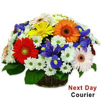 FiestaIt is a riot of colours with this wholesome arrangement of Daises, Gerberas and Blue Iris complemented with green foliage. This wonderful arrangement comes in a beautiful basket. Note: Due to unavailability of seasonal flowers, some flowers may be substituted keeping the colour theme and the value consistent with the original product.It is a riot of colours with this wholesome arrangement of Daises, Gerberas and Blue Iris complemented with green foliage. This wonderful arrangement comes in a beautiful basket. Note: Due to unavailability of seasonal flowers, some flowers may be substituted keeping the colour theme and the value consistent with the original product.