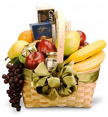 Sophisticated TastesA gift of distinction filled with the most delicious assortment of foods for any occasion. An elegant handled basket holds the freshest fruits, such as oranges, apples, kiwi, pears, bananas, and grapes. The fruits are complemented by savory snacks such as gourmet canned items , cheeses, and crackers. For a crowning touch, we add a selection of candies or chocolates. Exact basket and components may vary by season, delivery location, and size ordered.