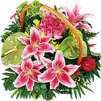 Love AffairPink roses, kaiser lilies and red gerberas offest by green anthuriums are arranged in a basket. The colors of love converge in this effortlessly gorgeous arrangement to make it the perfect gift.Pink roses, kaiser lilies and red gerberas offest by green anthuriums are arranged in a basket. The colors of love converge in this effortlessly gorgeous arrangement to make it the perfect gift.