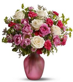 Roses and spray rosesRoses, spray roses, white and pink miniature carnations and Matsumoto asters