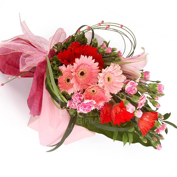 SeraphinLilies, passion red and pink gerberas and Carnations to make her day.