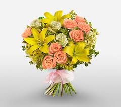 Simply classsicA beautiful contemporary, star studded collection of pink and cream spray roses, yellow lilies with seasonal flowers and greens in a bouquet tied with a light pink ribbon is sure to brighten up anyone's day.