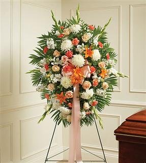 Funeral_White Sympathy Standing SprayThis Sympathy Standing Spray, in shades of peach, orange and white, is a beautiful symbol of your sympathy and support. • Peach roses, orange Asiatic lilies, white carnations and more