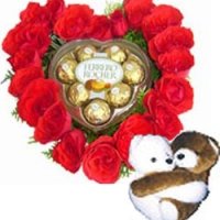 Love Of My Life...A teddyfic gift like 24 red roses in a basket with heart shape ferrero chocolate and couple bear to make your honey feel special...