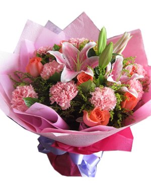 A Simple Greeting9 stems pink carnations, 9 stems pink roses and 1 stalks pink lilies with fresh solidago embellished. Writing a simple greeting such as hello, good day.