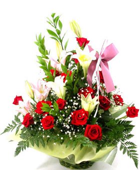 Affectionate19 red roses, 2 white lilies, 2 pink lilies, with green leaves