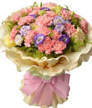 Flowers For Mom19 selected pink carnations, solidago canadensis and eustoma(or similar flora), light yellow edge curl paper round packing.