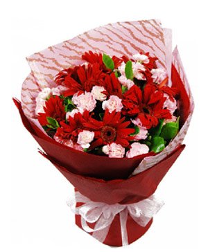 Good Wishes18 pink carnation + 10 red gerbera be packed in red crepe paper bouquet.