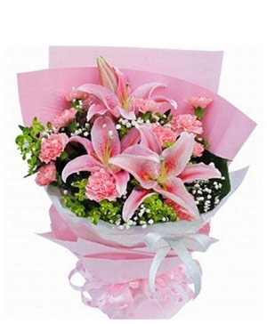 Pink Flower Love3 pink lilies, 12 pink carntions with baby's breath ornament, pink crepe paper packing.
