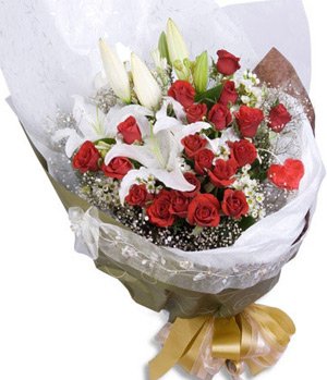 Speed ​​Lovered roses 20 stems, perfume white lilies 5 stems with baby's breath and green stuff. White gauze, gray crepe paper and ties bowknot hand bouquet