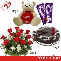 3 Days SerenadesDay 1. TWO feet tall Teddy Bear holding a heart with 2 Cadbury Dairy Milk Chocolates 65 gm each.( Dely on 12th Feb) Day 2. Mouth watering chocolate cake -500gm. ( Dely on 13 th Feb ) Day 3. Bunch of 12 Red Roses for your sweet heart. ( Dely on 14th Feb. ) Please note : Cake design n looks may vary depending upon local availability